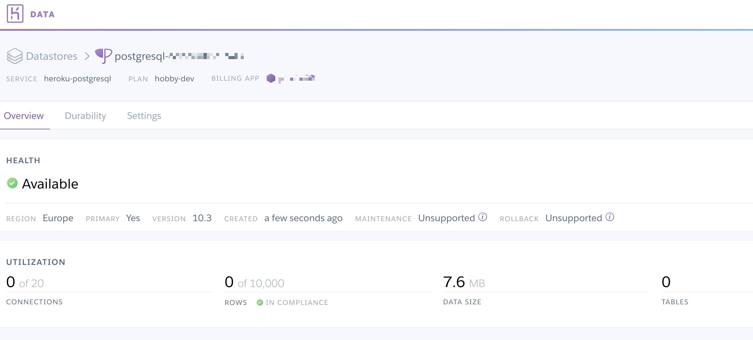 Click the “Heroku Postgres :: Database”. The database should shift into the Available state.