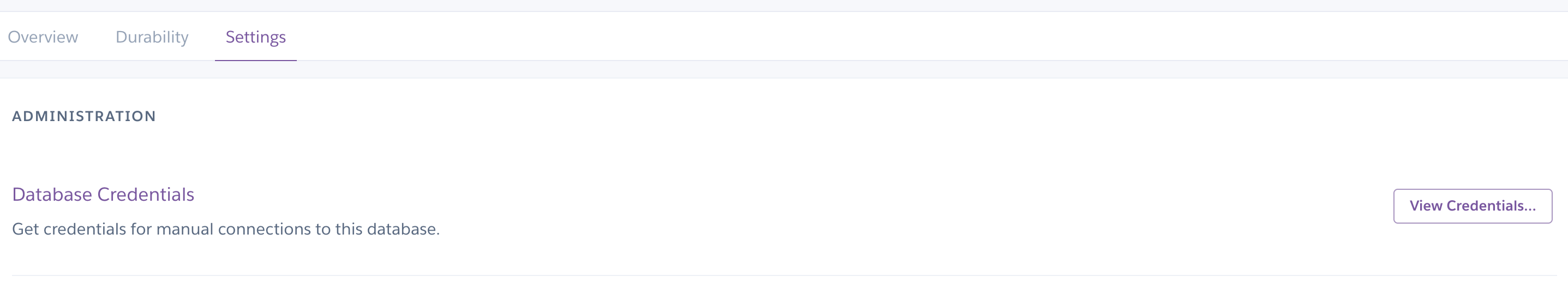 Click the tabs to see the database overview and settings. Click Settings > View credentials and save these settings for the next steps of the connection process.