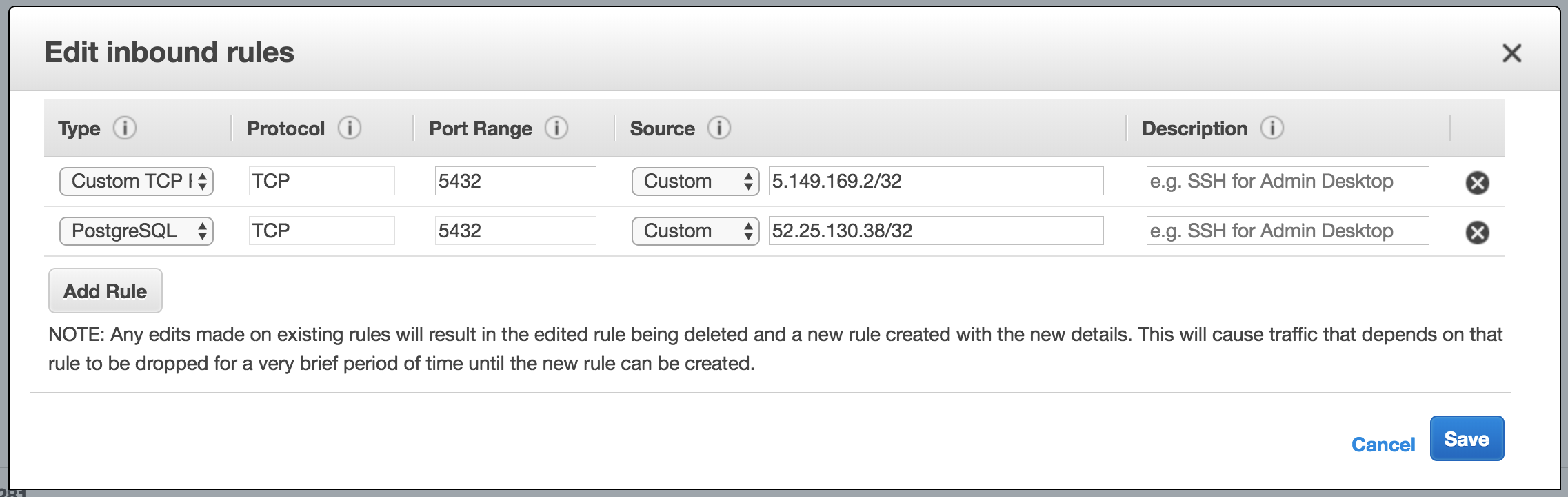 52.25.130.38/32. This will allow Segment to connect to the instance. Press Save when done.