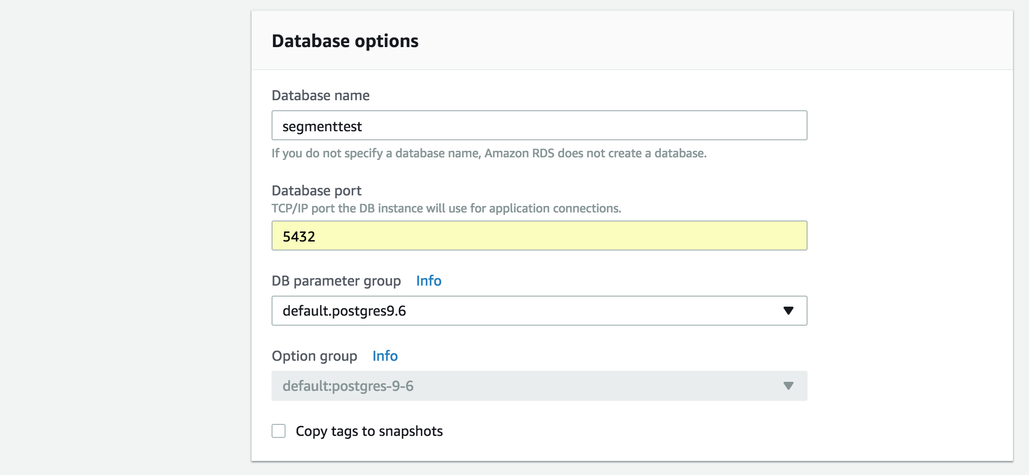 - Copy Tags To Snapshots specifies whether you want the tags metadata on DB instances copied to corresponding instance snapshots. It’s fine to leave it on the default, but you can learn more about it here.