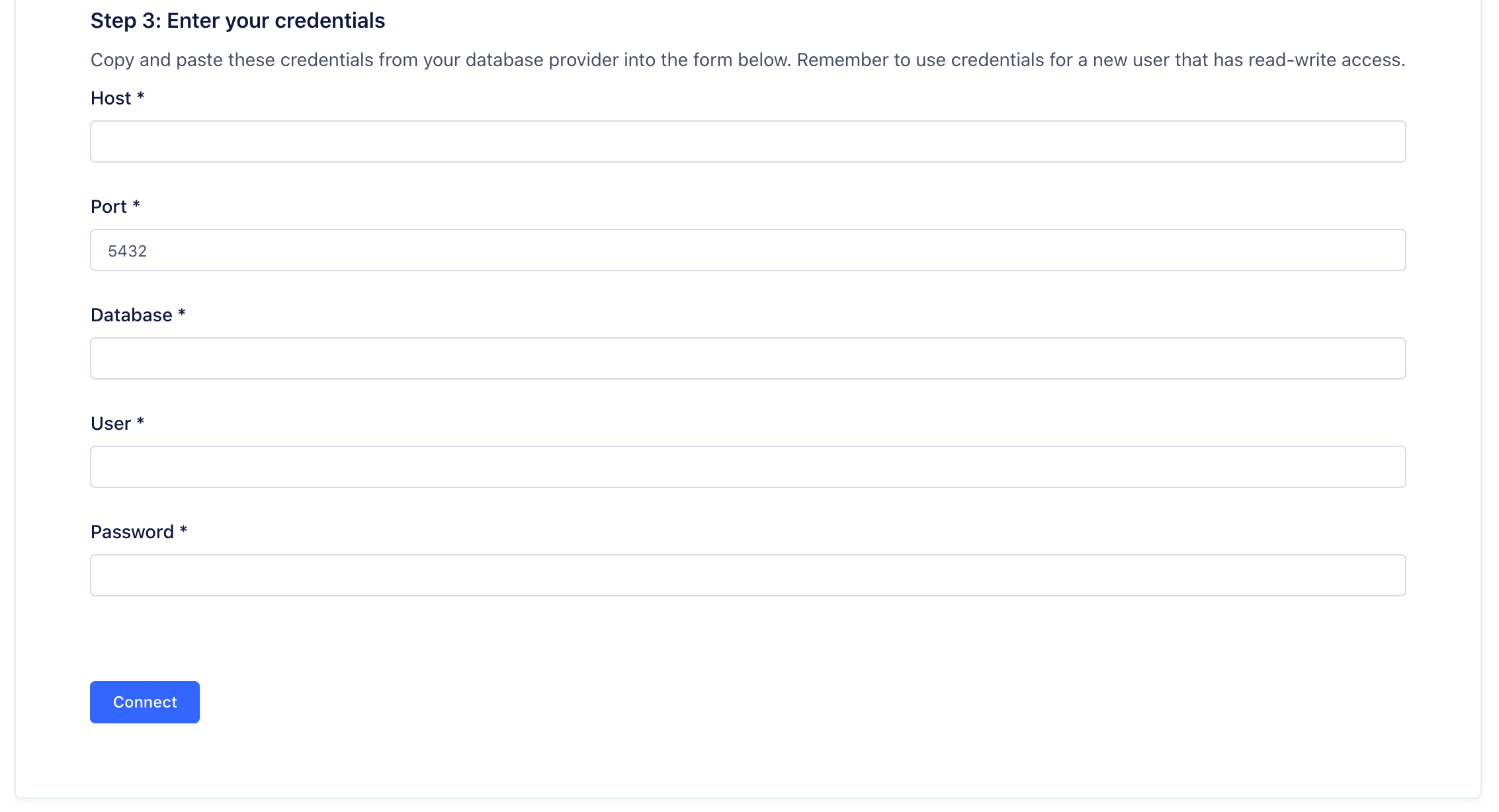 Select Postgres database. Then, copy the relevant settings into the text fields on this page and clicking Connect.