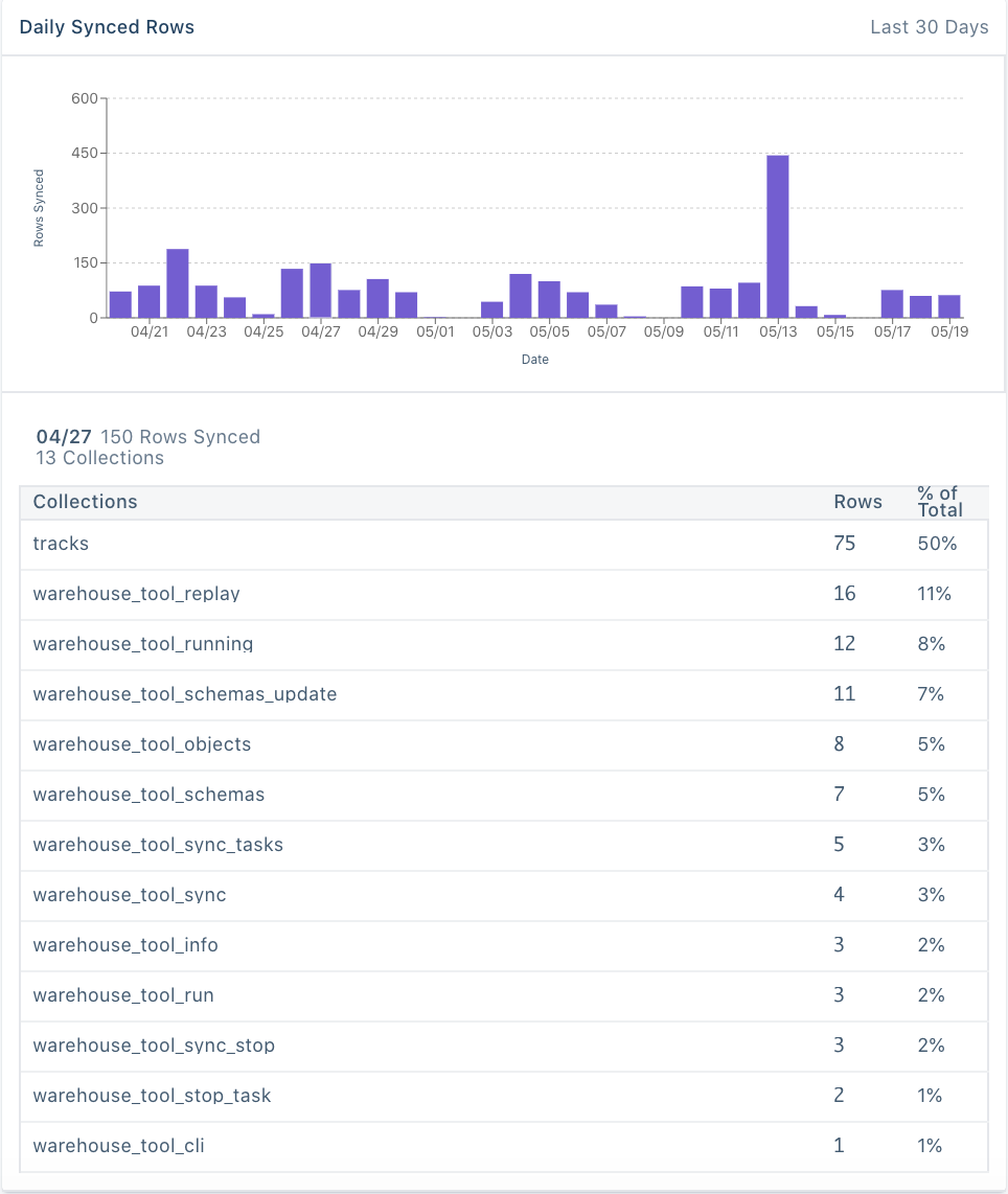 - Health - The Health tab provides an aggregate view of syncs to a warehouse over time. You can either look at this at a warehouse level, or warehouse-source level. This shows information about the volume of rows synced over the last 30 days.