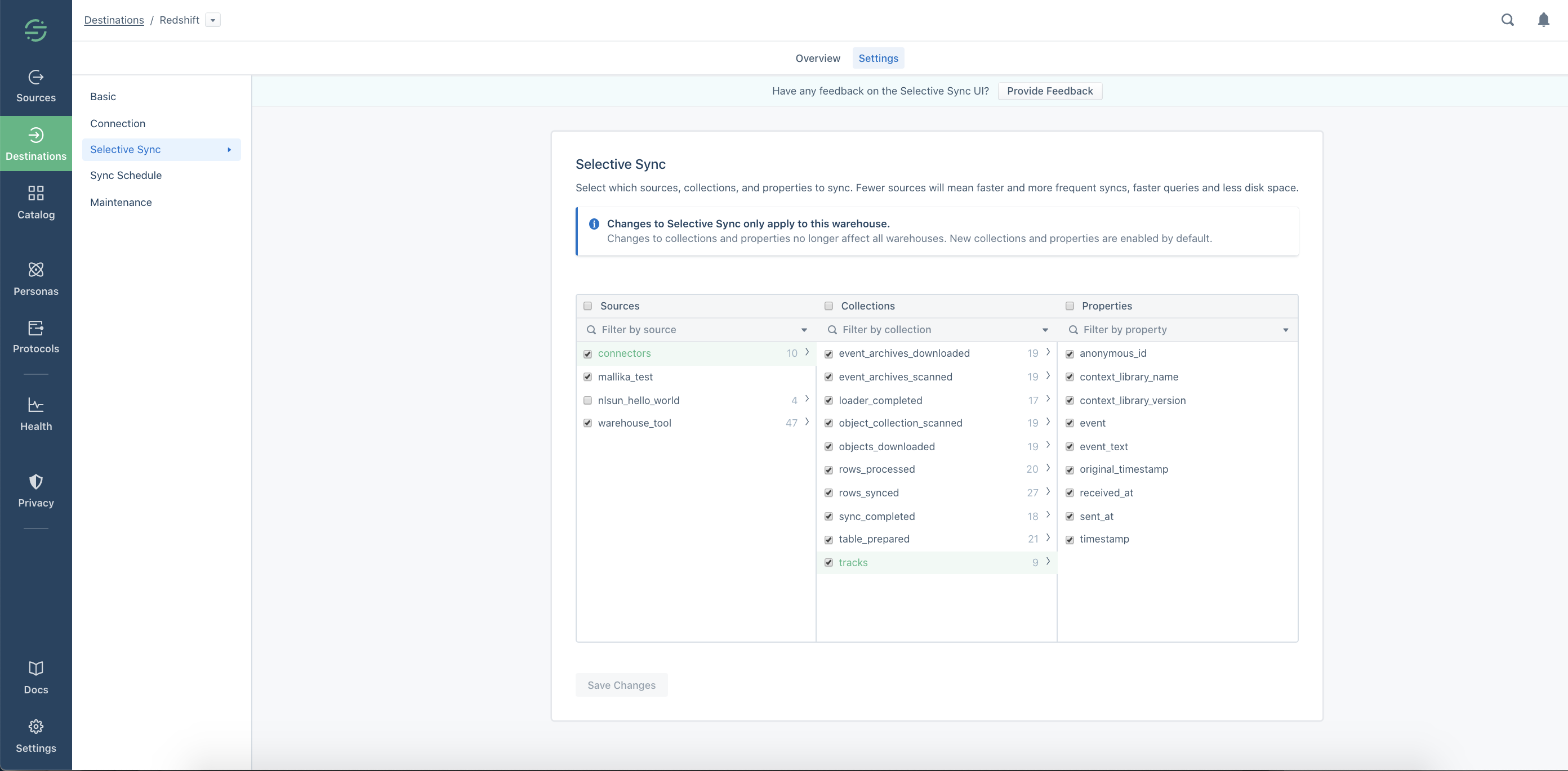 Warehouse Selective Sync allows you to manage the data that you send to your warehouses. You can use this feature to stop syncing specific events (also known as collections) or properties that aren’t relevant, and could be slowing down your warehouse syncs.