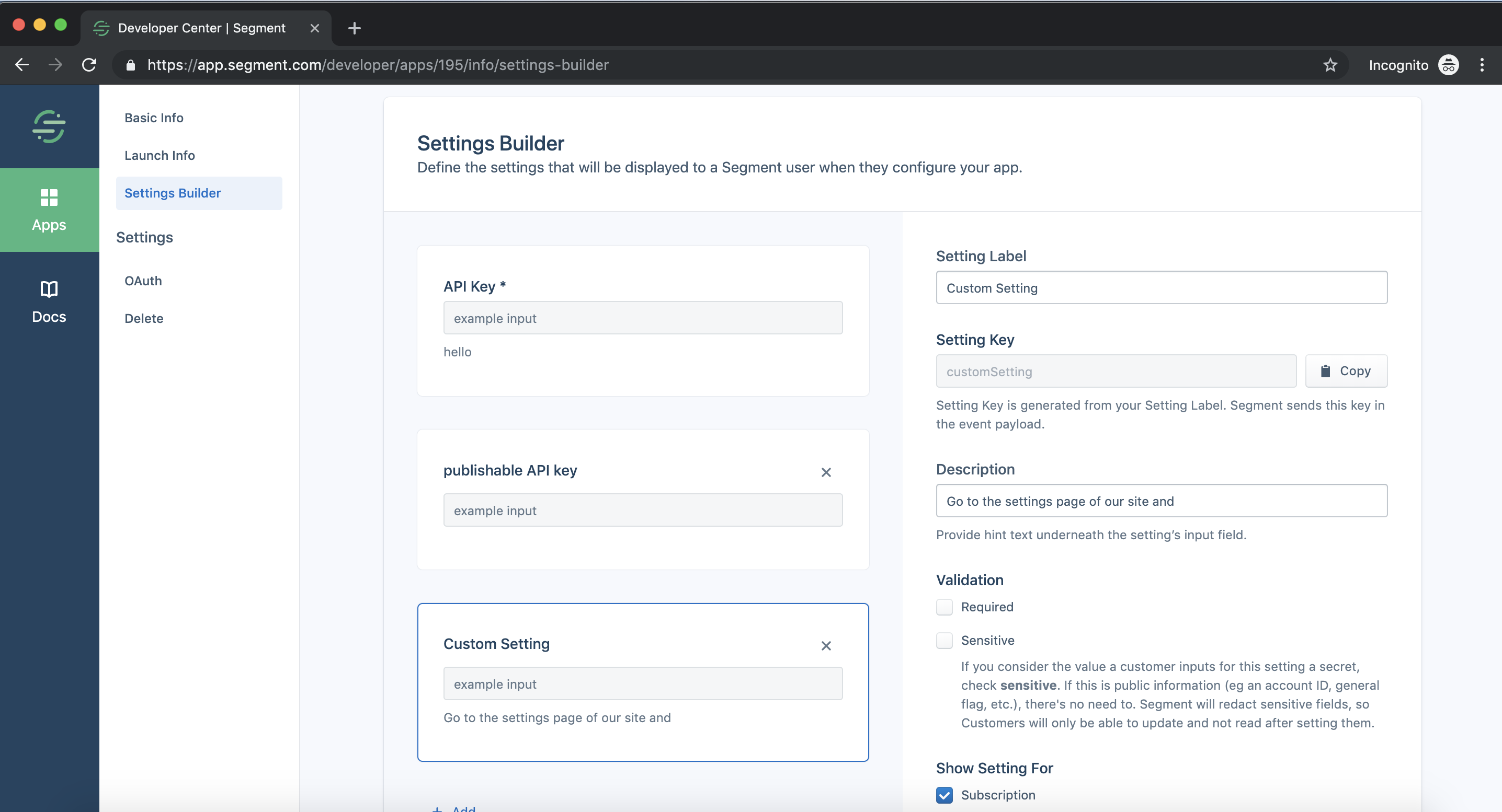 All subscriptions have an API key setting by default, which Segment will send in the Authorization Header. To add more custom settings, go to the Settings Builder page under App Info.