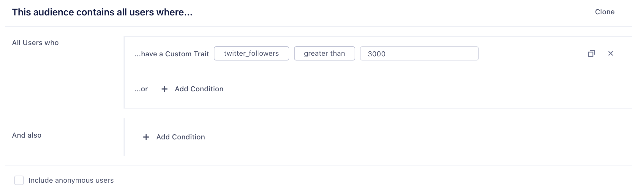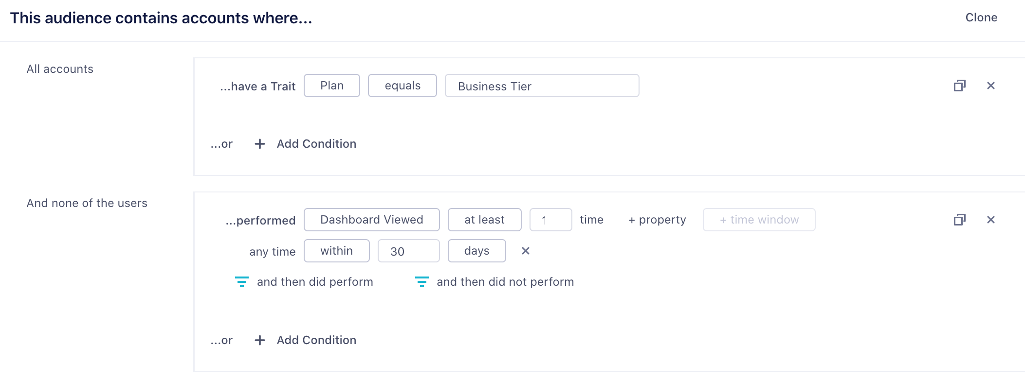 If you are a B2B business, you might want to build an audience of accounts. You can use both account-level traits that you’ve sent through the group call, or user-level traits and events. For example, you might want to re-engage a list of at-risk accounts defined as companies which are on a business tier plan and where none of the users in that account have logged in recently. When incorporating user-level events or traits, you can specify None of the users, Any users, or All users.