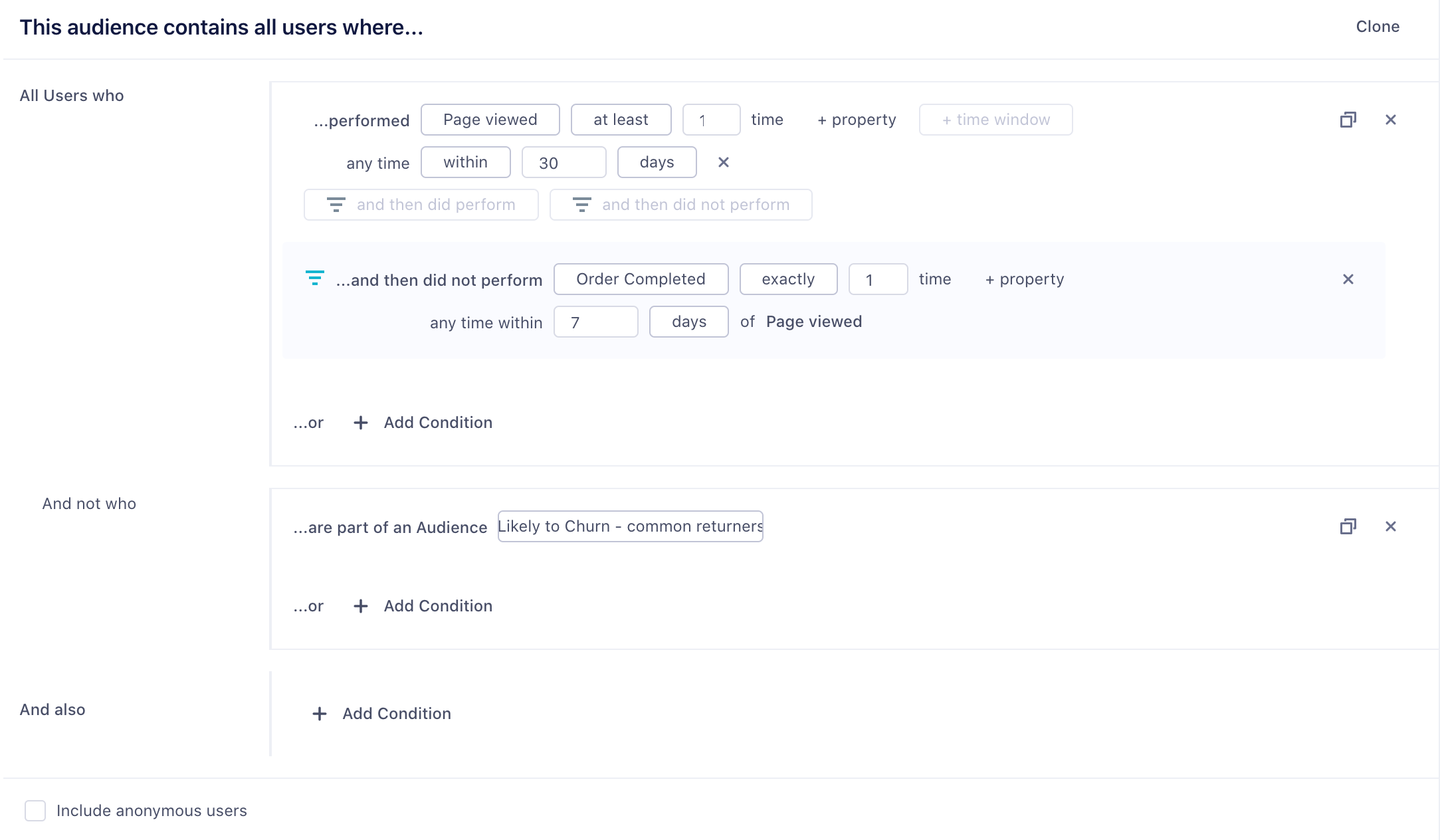 You can also specify two different types of time-windows, within and in between. Within lets you specify an event that occurred in the last x number of days. In-between lets you specify events that occurred over a rolling time-window in the past. A common use case is to look at all customers that were active 30 to 90 days ago, but have not completed an action in the last 30 days.