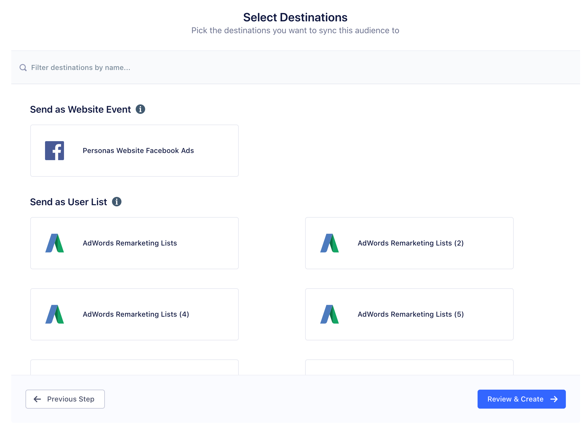 To preview your audience, click Select Destinations, then click Review & Create.