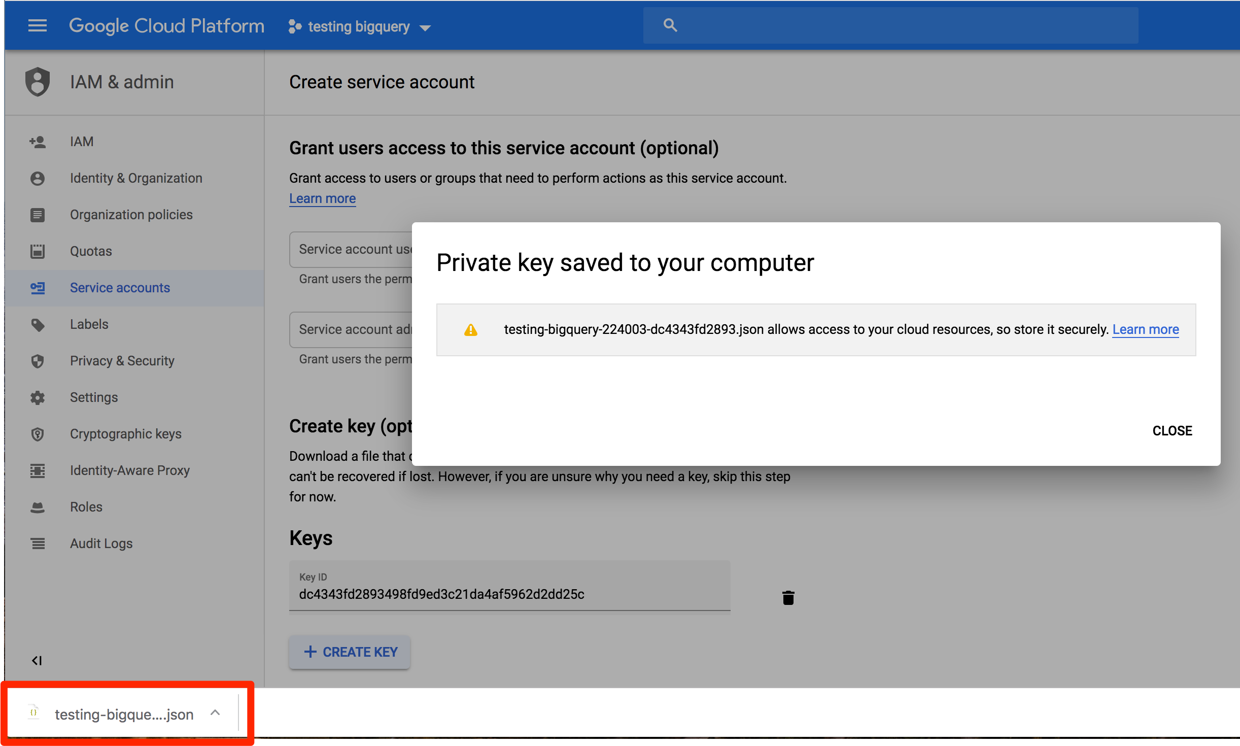 A file with the key is saved to your computer. Save this, because you’ll need it to set up the warehouse source in the next step.