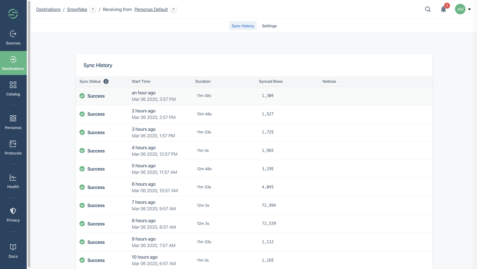 Although Personas can compute audiences and traits in real-time, these calculations are subject to the sync schedule allowed by your warehouses plan, which is usually hourly. You can check the warehouse sync history to see details about past and upcoming syncs. When you look at the sync schedule, sources with the personas_ prefix sync data from Personas.