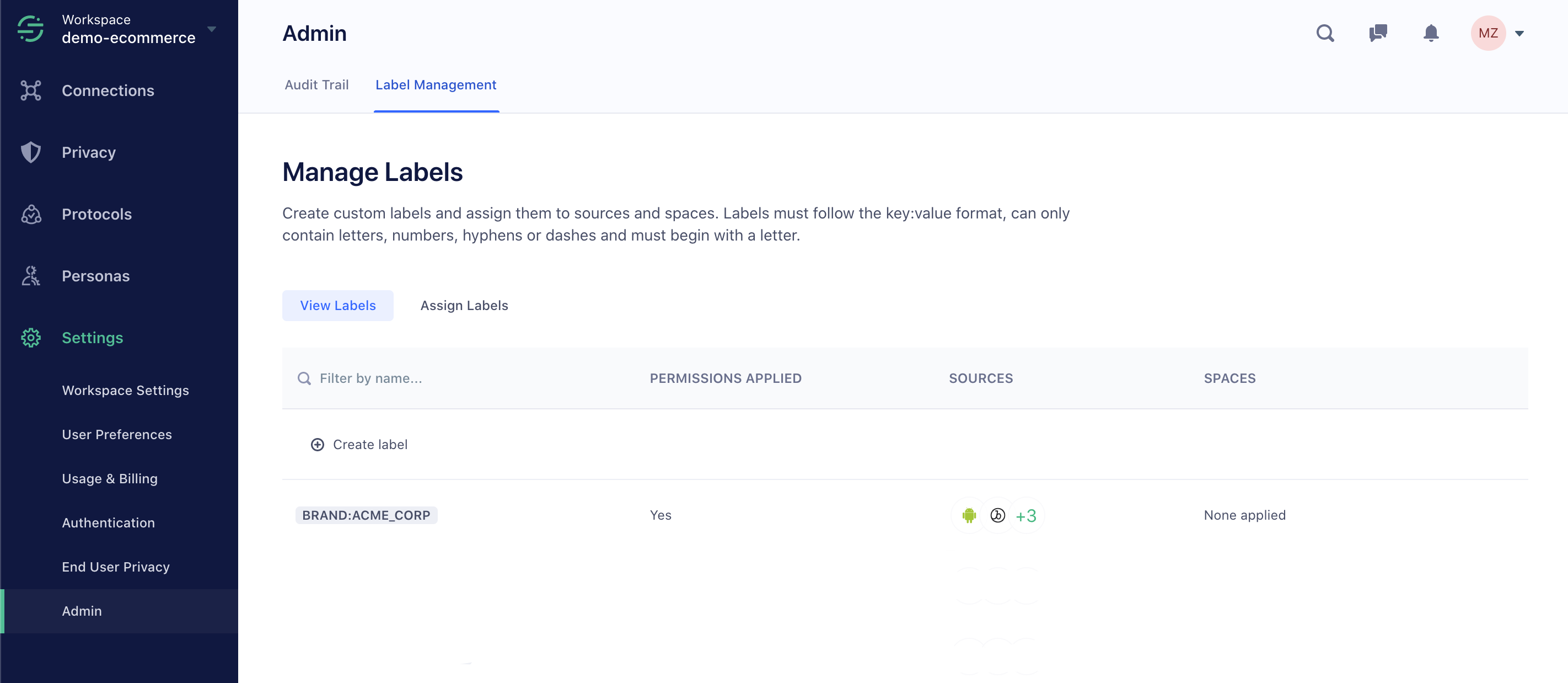 To create additional custom labels, a workspace owner can create new key types in the Labels screen. The workspace owner can customize any combination of labels to mirror how resources should be partitioned in their organization. For example, some organizations may prefer to restrict access on their Sources and Personas Spaces by brand or product area while other organizations may find it more useful to restrict their resources by tech stack or engineering department.